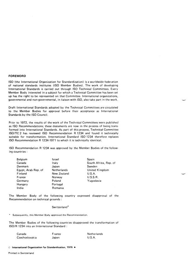 IS0 Recommendation R 1234 was approved by the Member Bodies of the follow-