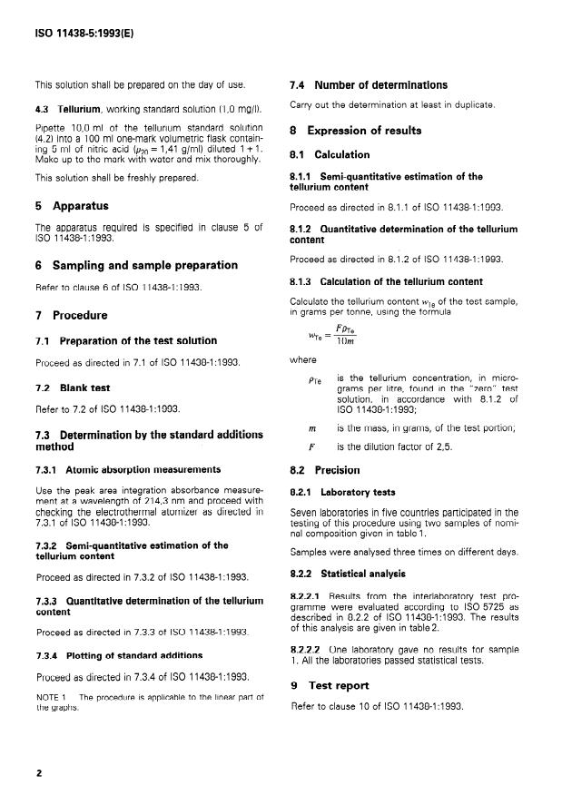 ISO 11438-5:1993 is a standard published by the International Organization for Standardization (ISO). Its full title is "Ferronickel — Determination of trace-element content by electrothermal atomic absorption spectrometric method — Part 5: Determination of tellurium content". This standard covers: The principle of the method specified is dissolution of a test portion in nitric acid, measurement of the absorption of the resonance line energy from the spectrum of tellurium in the test solution at a wavelength of 214,3 nm by an atomic absorption spectrometer fitted with a graphite furnace electrothermal atomizer, calibration by the standard additions method described in ISO 11438-1. Applies to tellurium contents in the range of 0,3 g/t to 2,0 g/t in ferronickel.