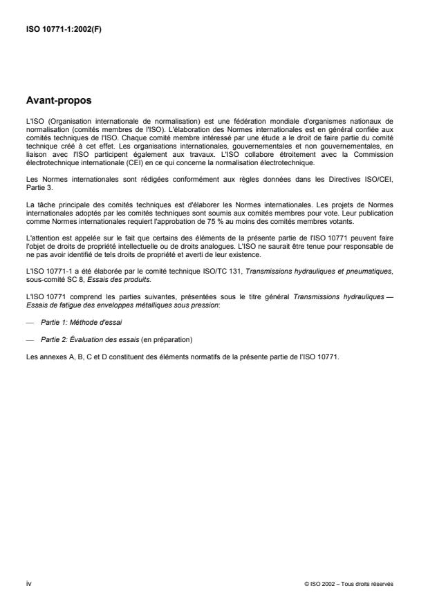L'ISO 10771-1 spécifie une méthode d'essai de fatigue des enveloppes sous pression de composants utilisés dans les systèmes de transmissions hydrauliques sous des charges régulières cycliques de pression interne. L'ISO 10771-1 est applicable uniquement aux enveloppes sous pression qui sont fabriquées en métal, qui fonctionnent à des températures qui excluent le fluage et la fragilisation à basse température, qui sont soumises uniquement à contraintes induites par la pression, qui ne sont pas sujettes à des baisses de résistance dues à la corrosion ou à une autre action chimique, et qui peuvent inclure les garnitures, les joints et autres composants non métalliques; cependant, ceux-ci ne sont pas considérés comme faisant partie de l'enveloppe sous pression soumise à essai.