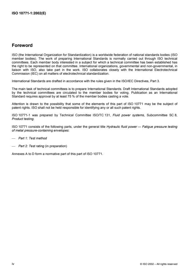ISO 10771 specifies a method of fatigue testing the pressure-containing envelopes of components used in hydraulic fluid power systems under sustained steady cyclic internal pressure loads. ISO 10771 is only applicable to component pressure-containing envelopes that are manufactured from metals, are operated at temperatures that exclude creep and low-temperature embrittlement, are only subjected to pressure-induced stresses, are not subjected to loss of strength due to corrosion or other chemical action and may include gaskets, seals and other non-metallic components; however, these are not considered part of the pressure-containing envelope being tested.