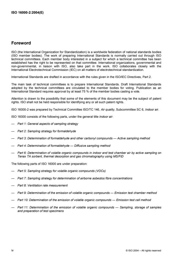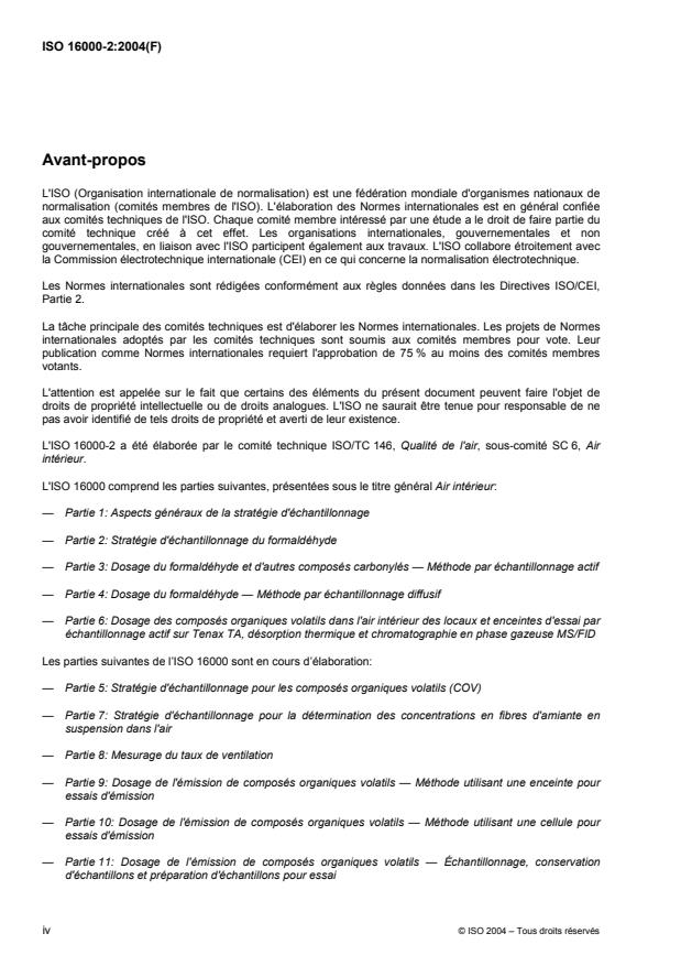 L'ISO 16000-2:2004 est destinée à faciliter la planification des mesurages de la pollution au formaldéhyde dans l'air intérieur . Dans le cas de mesurages dans l'air intérieur, la planification soigneuse de l'échantillonnage et la stratégie globale d'échantillonnage jouent un rôle particulièrement important car le résultat obtenu lors du mesurage peut être lourd de conséquences en ce qui concerne, par exemple, la nécessité d'établir des actions correctives ou le succès de telles actions.