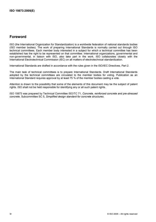 ISO 15673:2005 applies to the planning, design and construction of structural reinforced concrete structures to be used in new low-rise buildings with restricted occupancy, number of stories, and area. The purpose of ISO 15673:2005 is to provide a registered civil engineer or architect with sufficient information to design the reinforced-concrete structural framing of a low-rise building that complies with these limitations. The rules of design as set forth in ISO 15673:2005 are simplifications of the more elaborate requirements. ISO 15673:2005 may be used as an alternative to the development of a national concrete building code, or equivalent document, in countries where no national design codes themselves are available, or as an alternative to the national concrete building code in countries where it is specifically considered and accepted by the national standard body or other appropriate regulatory organization.