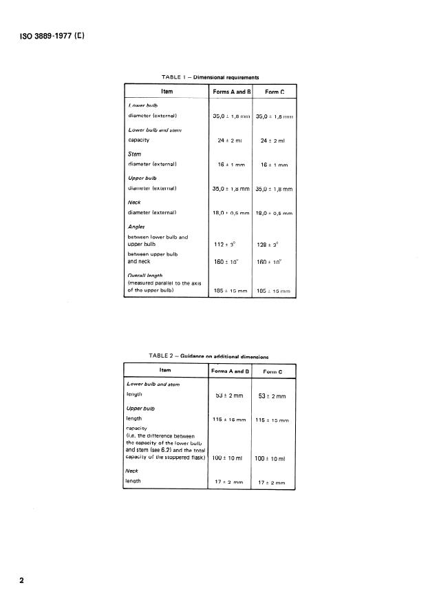 ISO 3889:1977 is a standard published by the International Organization for Standardization (ISO). Its full title is "Milk and milk products — Determination of fat content — Mojonnier-type fat extraction flasks". This standard covers: Specifies the characteristics of flasks for gravimetric methods. The flasks to be made from borosilcate glass are designed to enable a supernatant solvent layer to be decanted almost completely from an underlaying aqueous layer. A figure shows three permissible forms of flask whose dimensions are listed in a table. A second table gives guidance on additional dimensions for these flask types.