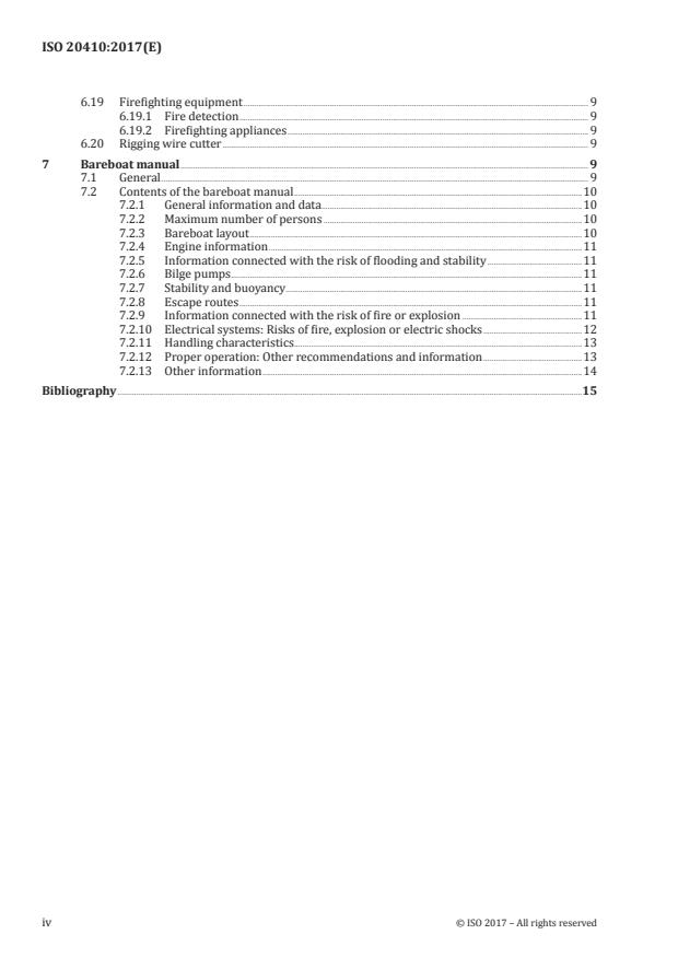 ISO 20410:2017 sets out the minimum service level and equipment requirements for bareboats offered for charter on inland, coastal and/or offshore waters. It is applicable to any individual or organization that offers a bareboat for charter. ISO 20410:2017: · covers the safety of the bareboat and its occupants, but not associated sport or water-based recreational activities; · excludes boats that are provided with a skipper and/or crew and bareboats that do not have living accommodation; · does not establish the construction requirements for bareboats and equipment provided.