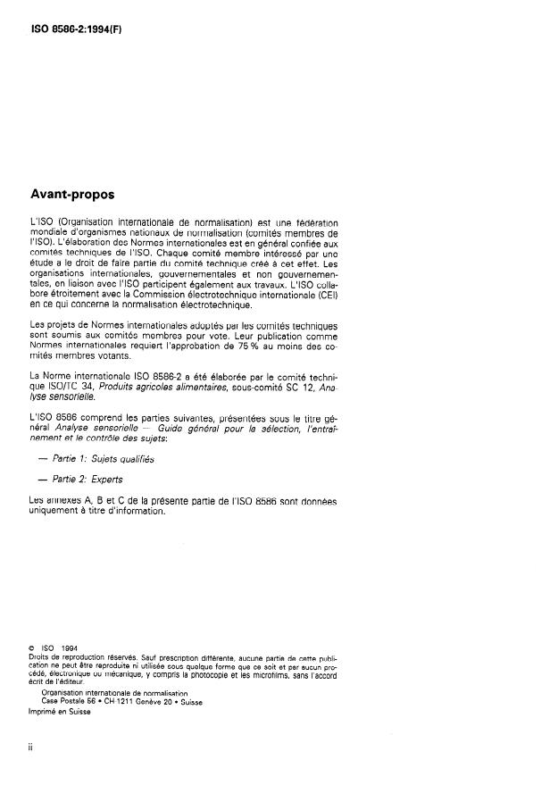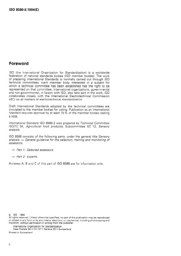 ISO 8586-2:1994 is a standard published by the International Organization for Standardization (ISO). Its full title is "Sensory analysis — General guidance for the selection, training and monitoring of assessors — Part 2: Experts". This standard covers: Describes criteria for choosing people with particular sensory skills from selected assessors or from product, process or marketing specialists who themselves satisfy the selection criteria specified in ISO 8586-1. Gives principles and procedures for expanding their knowledge and abilities to the levels required for experts assessors. Supplements the information given in ISO 6658.