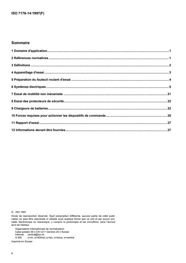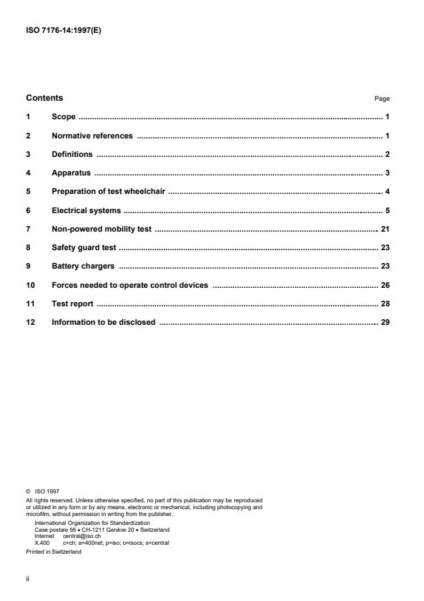 ISO 7176-14:1997 is a standard published by the International Organization for Standardization (ISO). Its full title is "Wheelchairs — Part 14: Power and control systems for electric wheelchairs — Requirements and test methods". This standard covers: Wheelchairs — Part 14: Power and control systems for electric wheelchairs — Requirements and test methods