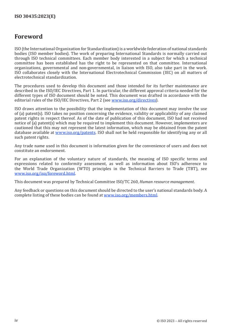 ISO 30435:2023 is a standard published by the International Organization for Standardization (ISO). Its full title is "Human resource management - Workforce data quality". This standard covers: This document provides the basis for organizational improvement underpinned by quality workforce data that supports analysis and evidenced-based decision-making. Workforce data quality, for the purpose of this document, is the process of: a) workforce data determination; b) data capture; c) data maintenance; d) data review processes. The focus of this document is on the quality of data itself rather than on other critical aspects relating to the overall management of data, such as privacy and security of personal data, the analysis and reporting of data and the use of technology. This document does not cover the analysis of data and reporting structure or the definition of any metric other than quality of workforce data. Technology platforms in the form of human resource information systems, databases, spreadsheets, and the like, can improve the process of the capture and management of data. The focus of this document is the data itself. While data security and data privacy are also critical to the overall management of data, they are not dealt with in this document. This document is applicable to all types and sizes of organization across all industry sectors and regions.