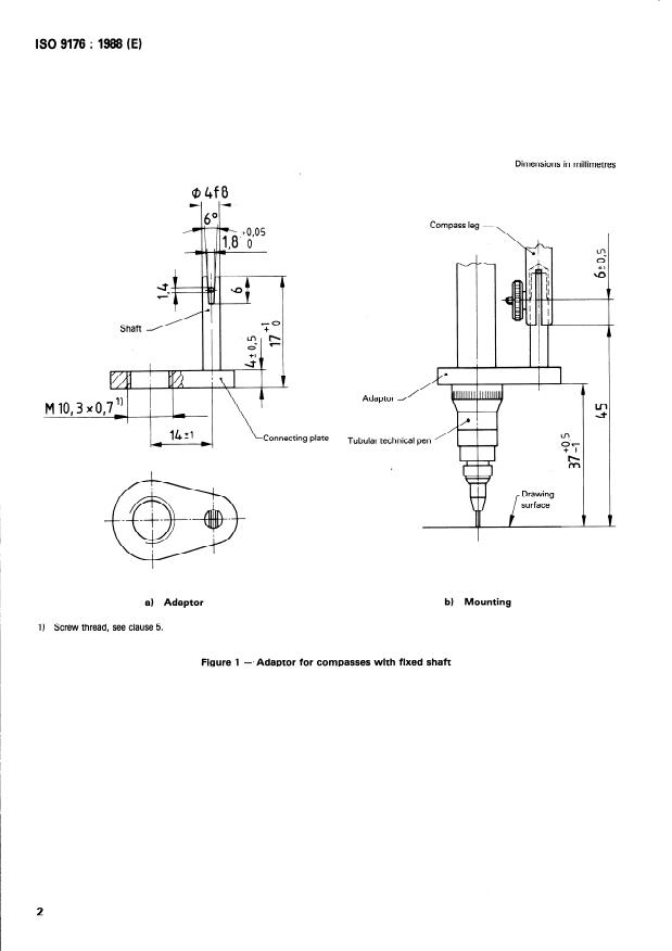 ISO 9176:1988 is a standard published by the International Organization for Standardization (ISO). Its full title is "Tubular technical pens — Adaptor for compasses". This standard covers: La présente Norme internationale prescrit les dimensions préférentielles des adaptateurs de plumes tubulaires à utiliser sur les compas à pointes interchangeables1) et des filetages d'adaptation de ces plumes tubulaires sur ces compas.