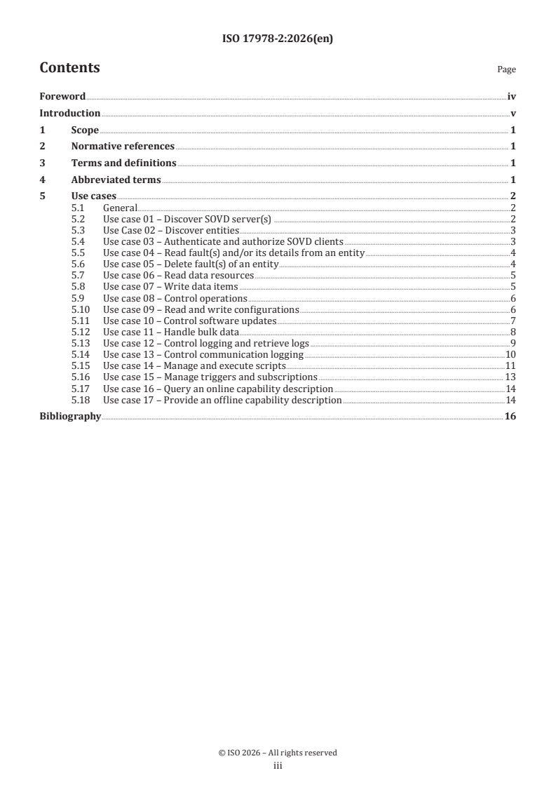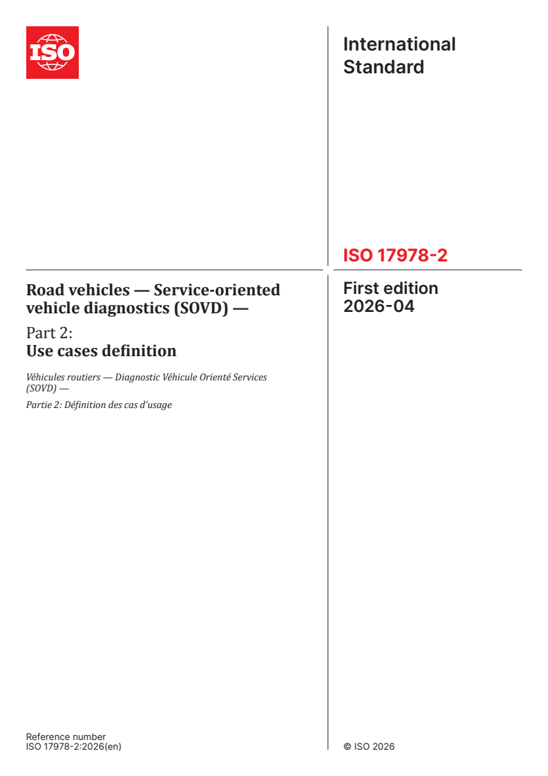 ISO 17978-2:2026 is a standard published by the International Organization for Standardization (ISO). Its full title is "Road vehicles — Service-oriented vehicle diagnostics (SOVD) — Part 2: Use cases definition". This standard covers: This document gives an overview of the service-oriented vehicle diagnostics (SOVD) use cases. Each use case consists of name, inputs, outputs, a description and examples. Use cases are described in an abstracted form to be independent of the underlying technologies.