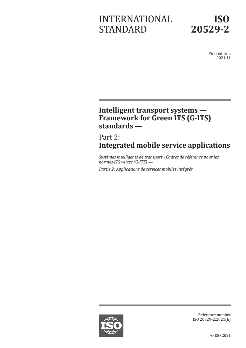 ISO 20529-2:2021 - Intelligent transport systems — Framework for Green ITS (G-ITS) standards — Part 2: Integrated mobile service applications Released:11/16/2021