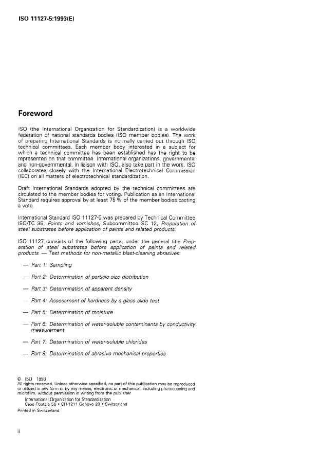 ISO 11127-5:1993 is a standard published by the International Organization for Standardization (ISO). Its full title is "Preparation of steel substrates before application of paints and related products — Test methods for non-metallic blast-cleaning abrasives — Part 5: Determination of moisture". This standard covers: The procedure includes weighing a test portion of approximately 100 g into a container, placing the container with the test portion in an oven previously adjusted to 110 °C, leaving for at least 1 h, transferring the container to a desiccator, allowing to cool to room temperature, reweighing the container with the dried test portion, determining the mass of the dried test portion. Annex A gives information on the international standards series for non-metallic blast-cleaning abrasives ISO 11126 and ISO 11127.