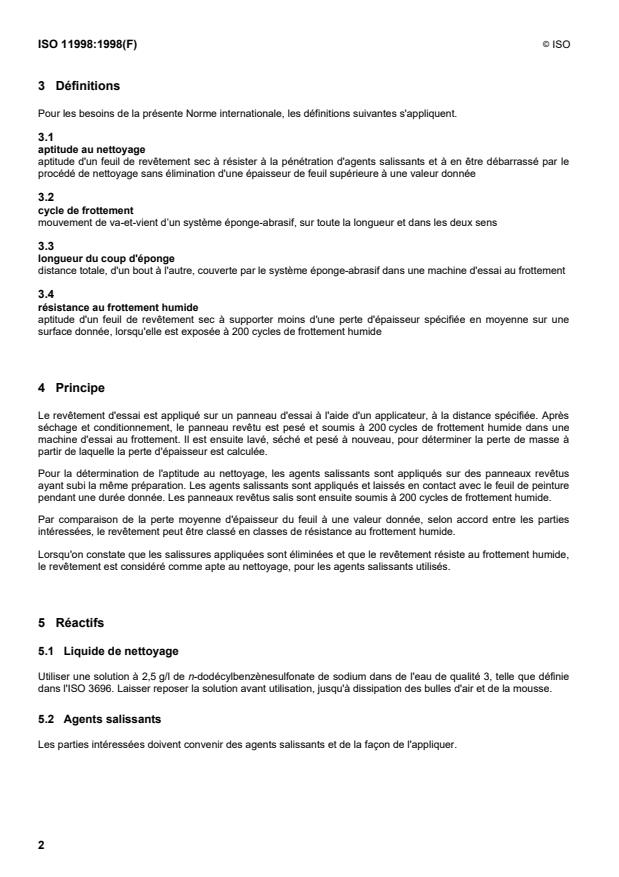 La capacité des revêtements à résister à l'usure causée par des nettoyages répétés et à ne pas se tacher de manière indélébile est un facteur important, tant d'un point de vue pratique que pour la comparaison et l'appréciation de ces revêtements. La présente Norme internationale prescrit des méthodes accélérées pour la détermination de la résistance au frottement humide. En ce qui concerne l'aptitude au nettoyage des revêtements, elle spécifie seulement la méthode elle-même, et non les agents salissants. NOTE- Ces propriétés ne dépendent pas seulement de la qualité du revêtement, mais également du subjectile, de la méthode d'application, des conditions de séchage et d'autres facteurs;les résultats obtenus ne sont donc pas directement utilisables dans la pratique. Dans la présente Norme internationale, l'évaluation du revêtement est effectuée d'après un subjectile donné, selon une méthode d'application établie, dans des conditions de séchage spécifiées et selon une méthode définie de frottement humide.