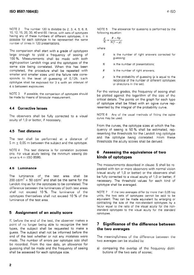 ISO 8597:1994 is a standard published by the International Organization for Standardization (ISO). Its full title is "Optics and optical instruments — Visual acuity testing — Method of correlating optotypes". This standard covers: Lays down a method of correlation between a given set of optotypes and the standard optotype (Landolt ring) specified by ISO 8596.
