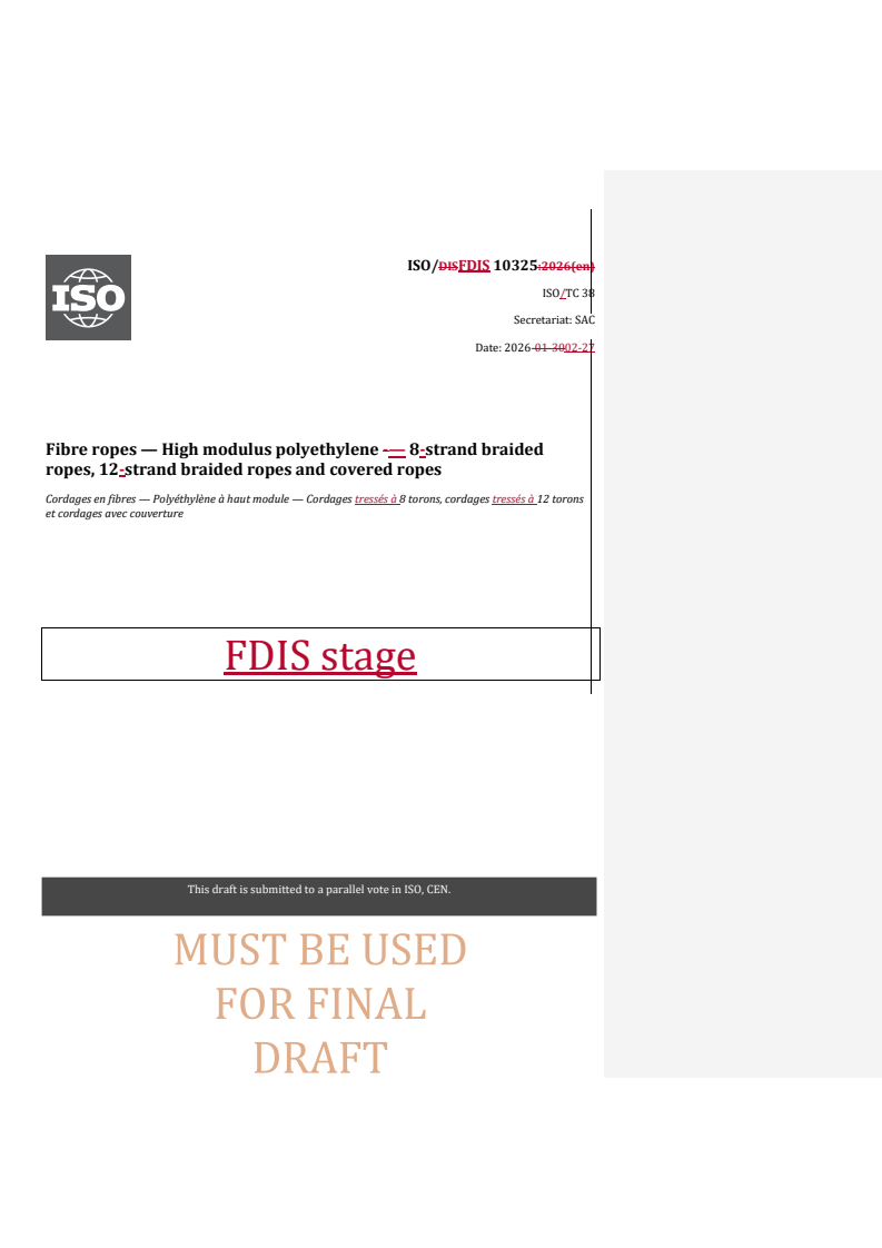 ISO/FDIS 10325 - Cordages en fibres — Polyéthylene a haut module — Cordages tressés a 8 torons, cordages tressés a 12 torons et cordages avec couverture Released:7. 07. 2025