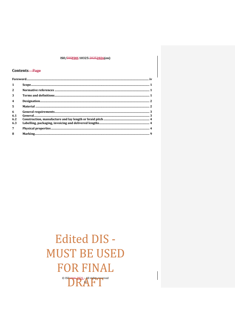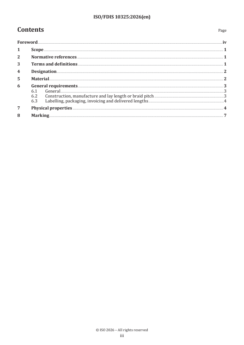 This document is critical for manufacturers, users, and specifiers who need to align rope design and properties with the demands of specific applications. While ISO/FDIS 10325 includes classification and property tables for reference, it highlights the need for consultation with rope manufacturers to select the appropriate type and grade to meet operational requirements, as not all variants and performance characteristics are covered by the standard.