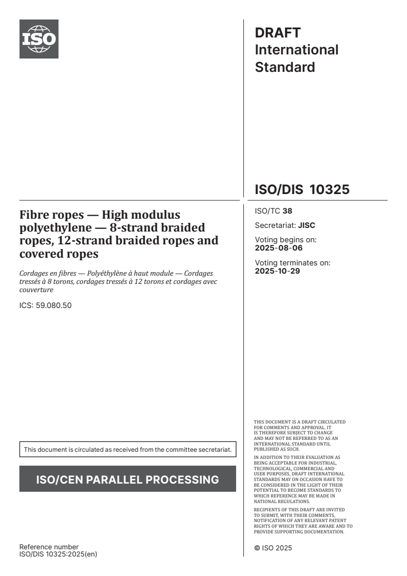 ISO/FDIS 10325 - Fibre ropes — High modulus polyethylene — 8-strand braided ropes, 12-strand braided ropes and covered ropes/11/2025