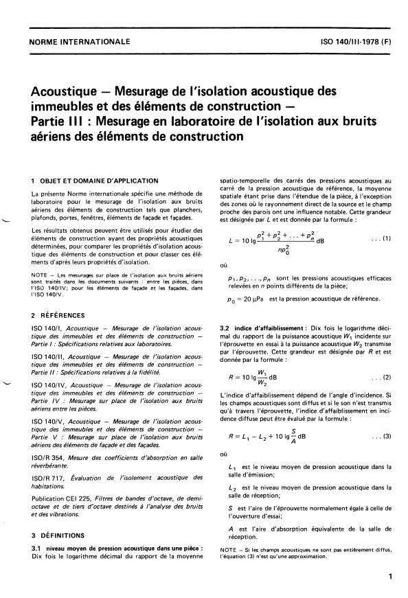 ISO 140-3:1978 is a standard published by the International Organization for Standardization (ISO). Its full title is "Acoustics — Measurement of sound insulation in buildings and of building elements — Part 3: Laboratory measurements of airborne sound insulation of building elements". This standard covers: Acoustics — Measurement of sound insulation in buildings and of building elements — Part 3: Laboratory measurements of airborne sound insulation of building elements