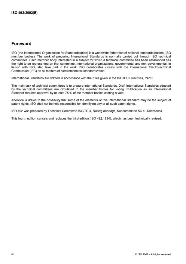 ISO 492:2002 - Rolling bearings - Radial bearings - Tolerances은 ISO 15, ISO 355 및 ISO 8443에 명시된 원통형 구르기 베어링의 경계치(샴퍼 치수 제외) 및 운전 정확도에 대한 허용오차를 규정하는 표준이다. 이 국제 표준은 일부 특정 유형의 원통형 베어링(예: 그림컵 니들 롤러 베어링)이나 특정 산업(예: 항공체 베어링과 기기 정밀 베어링)에는 적용되지 않는다.
