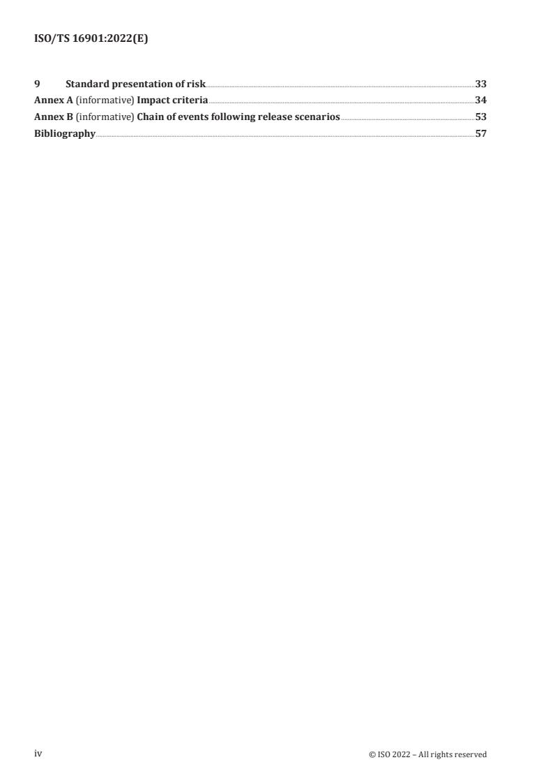 ISO/TS 16901:2022 is a technical specification published by the International Organization for Standardization (ISO). Its full title is "Guidance on performing risk assessment in the design of onshore LNG installations including the ship/shore interface". This standard covers: This document provides a common approach and guidance to those undertaking assessment of the major safety hazards as part of the planning, design, and operation of LNG facilities onshore and at shoreline using risk-based methods and standards, to enable a safe design and operation of LNG facilities. The environmental risks associated with an LNG release are not addressed in this document. This document is applicable both to export and import terminals but can be applicable to other facilities such as satellite and peak shaving plants. This document is applicable to all facilities inside the perimeter of the terminal and all hazardous materials including LNG and associated products: LPG, pressurized natural gas, odorizers, and other flammable or hazardous products handled within the terminal. The navigation risks and LNG tanker intrinsic operation risks are recognised, but they are not in the scope of this document. Hazards arising from interfaces between port and facility and ship are addressed and requirements are normally given by port authorities. It is assumed that LNG carriers are designed according to the IGC code, and that LNG fuelled vessels receiving bunker fuel are designed according to IGF code. Border between port operation and LNG facility is when the ship/shore link (SSL) is established. This document is not intended to specify acceptable levels of risk; however, examples of tolerable levels of risk are referenced. See IEC 31010 and ISO 17776 with regard to general risk assessment methods, while this document focuses on the specific needs scenarios and practices within the LNG industry.