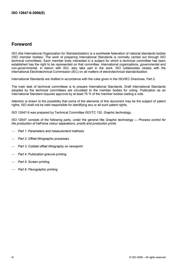 ISO 12647-6:2006 specifies a number of process parameters and their values to be applied to four-colour process printing by the flexographic printing process for packaging and publication, excluding newsprinting. The parameters and values are chosen in view of the complete process covering the process stages "colour separation", "film setting", "making of the printing forme", "proof production", "production printing" and "surface finishing". This covers printing on printing substrates which are nearly white or on films to which a white coating has been applied. ISO 12647-6:2006 is directly applicable to: publication flexographic printing including magazines, catalogues and commercial materials, and packaging flexographic printing including labels, boxes and flexible packages; half-tone and continuous tone proofing processes that predict the colorimetric results of flexograhic printing.