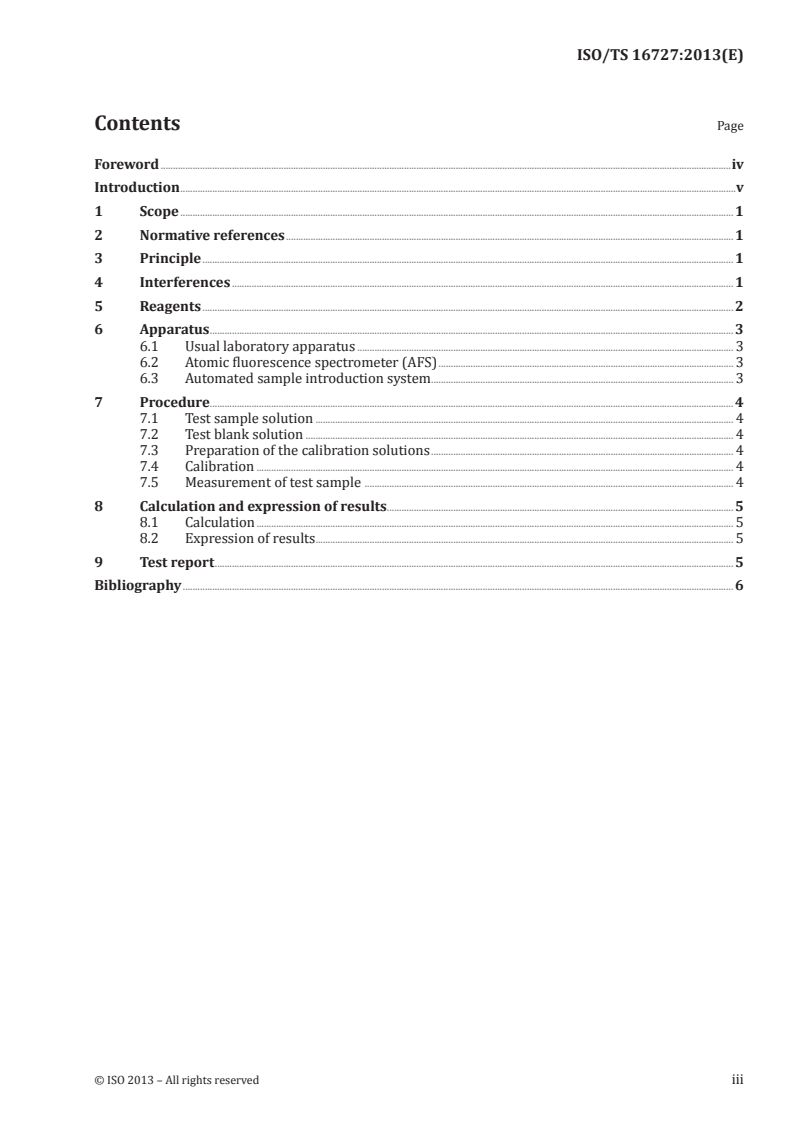 ISO/TS 16727:2013 is a technical specification published by the International Organization for Standardization (ISO). Its full title is "Soil quality - Determination of mercury - Cold vapour atomic fluorescence spectrometry (CVAFS)". This standard covers: ISO/TS 16727:2013 specifies a method for the determination of mercury in aqua regia or nitric acid digests of sludge, treated biowaste and soil, obtained according to ISO 11466 or ISO 16729 using cold vapour atomic fluorescence spectrometry. The lower working range limit is 0,003 mg/kg (dry matter).