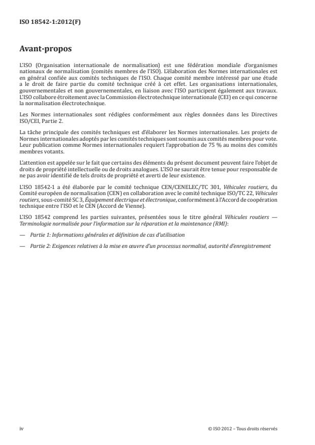 L'ISO 18542 comporte deux parties: la Partie 1 définit un cadre et un processus d'approbation de termes; la Partie 2 définit les exigences de mise en ?uvre d'un processus relatif à un système de gestion terminologique et à une autorité d'enregistrement, avec une annexe numérique. L'objectif fondamental de l'ISO 18542 est de faciliter la recherche par des opérateurs indépendants (OI) sur les sites Web d'information sur la réparation et la maintenance (RMI, repair and maintenance information) des constructeurs de véhicules (VM, vehicle manufacturers). L'ISO 18542-1:2012 donne un aperçu général et la structure de chaque partie de la norme. Elle spécifie également des cas d'utilisation relatifs à la terminologie pour l'information sur la réparation et la maintenance (RMI) afin de normaliser l'accès aux RMI pour des opérateurs indépendants. La fourniture de la terminologie RMI convenue pour l'automobile ne relève pas de l'ISO 18542 et ne fait donc pas partie du domaine d'application de l'ISO 18542-1:2012. Il est plutôt prévu que la terminologie RMI convenue pour l'automobile suive un cycle de vie allant au-delà de l'échéance de l'ISO 18542. Elle dépendra des travaux d'une autorité d'enregistrement, d'un groupe de révision de la terminologie pour sa création et sa gestion et d'une annexe numérique pour sa publication. En ce qui concerne l'élaboration de l'annexe numérique, des normes existantes seront revues et des éléments seront inclus si cela est approprié et possible.