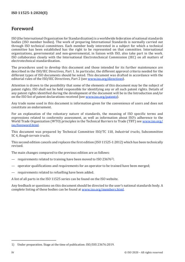 ISO 11525-1:2020 is a standard published by the International Organization for Standardization (ISO). Its full title is "Rough-terrain trucks — Safe use requirements — Part 1: Variable-reach trucks". This standard covers: This document specifies requirements for application, inspection, training, maintenance, repair and safe operation (herein referred to as safe use) of non-slewing variable-reach rough-terrain trucks (herein referred to as trucks), as defined in ISO 10896-1. It is intended to achieve the following: — the prevention of personal injuries, property damage and accidents; — the establishment of criteria for inspection, maintenance and operation; — the establishment of operator training requirements. The safe use requirements for slewing trucks, the interface between rough-terrain trucks and integrated personnel work platforms that can be fitted to rough-terrain trucks and the handling of freely suspended loads with rough-terrain trucks are covered by the other parts of the ISO 11525 series. The safe use requirements for non-integrated personnel work platforms are covered in ISO 18479‑2. This document is not applicable to lorry-mounted trucks. NOTE National or local requirements can apply.