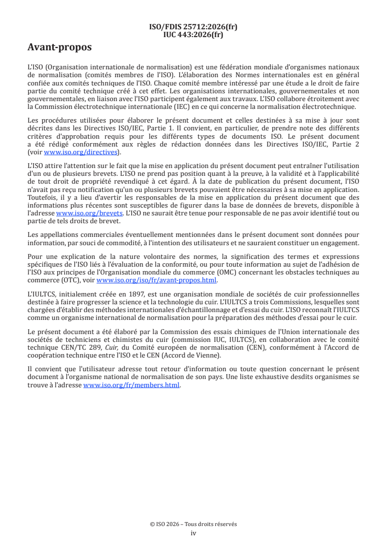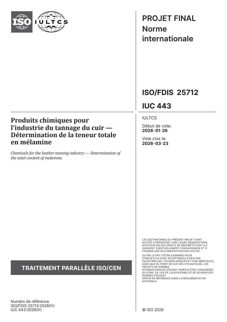 ISO/FDIS 25712 - Produits chimiques pour l'industrie du tannage du cuir — Détermination de la teneur totale en mélamine Released:4. 02. 2026