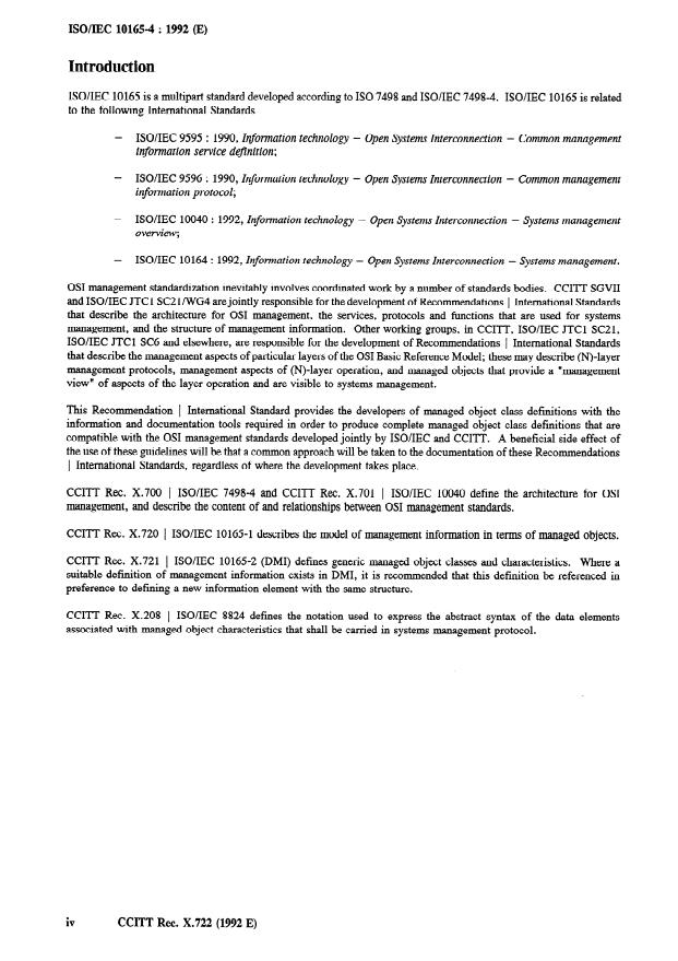 ISO/IEC 10165-4:1992 (identical to CCITT Recommendation X.722) provides guidelines for the definition of managed objects within the OSI systems management framework. It specifies how managed object classes should be documented and related to other OSI management Recommendations and International Standards. The standard is intended for any Recommendation or International Standard that defines management information to be transferred or manipulated by OSI management protocol (e.g., CMIP/CMIS) and the managed objects that represent that information.