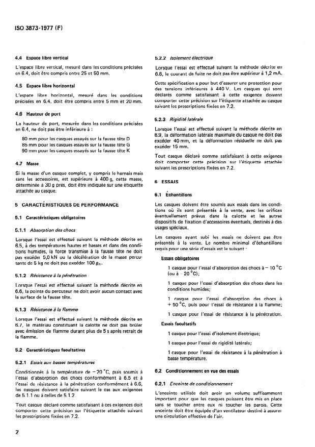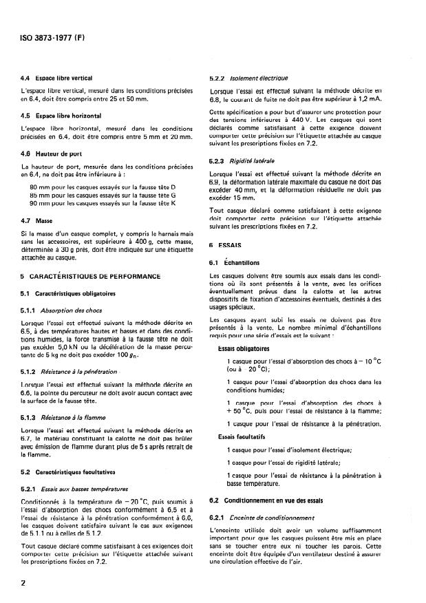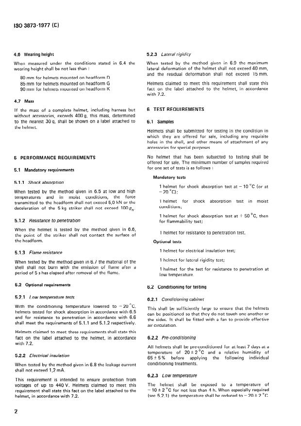 Keywords: ISO 3873:1977, industrial safety helmets, helmet standards, shock absorption, penetration resistance, flammability test, electrical insulation, lateral rigidity, helmet marking, PPE testing.