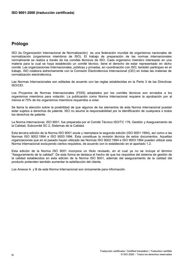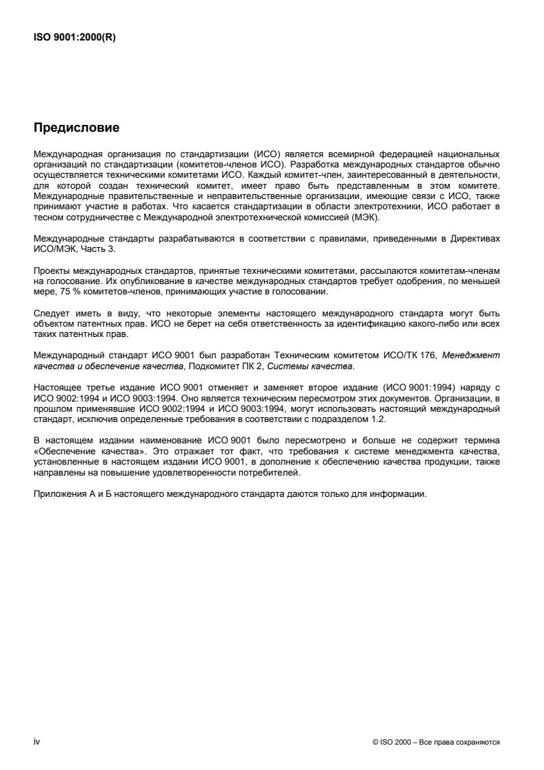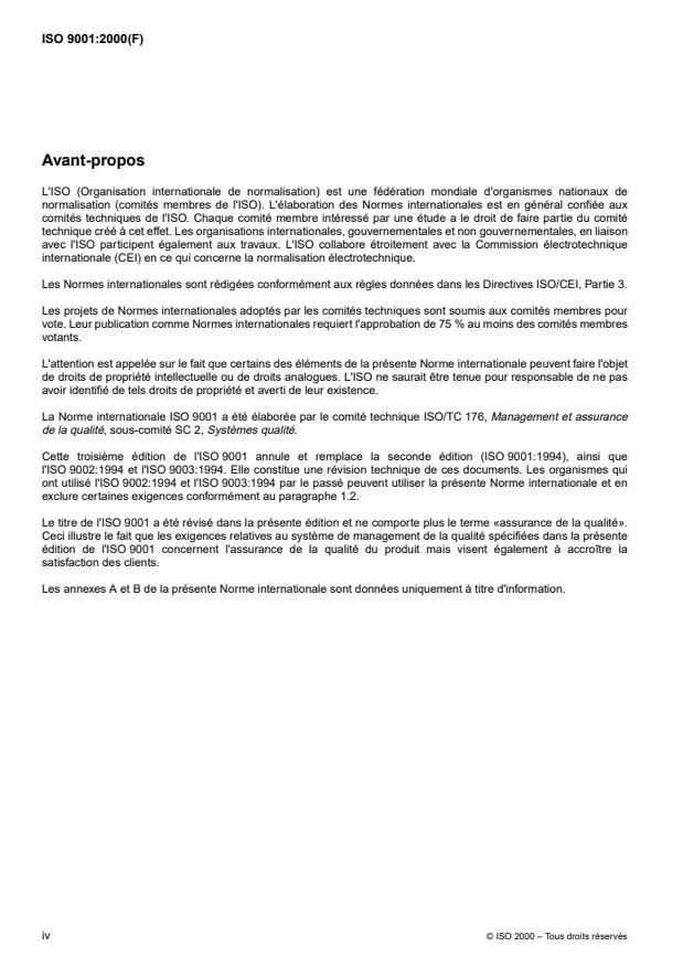 La Norme internationale ISO 9001:2000 spécifie les exigences relatives au système de management de la qualité lorsqu'un organisme doit démontrer son aptitude à fournir régulièrement un produit conforme aux exigences des clients et aux exigences réglementaires applicables, vise à accroître la satisfaction de ses clients par l'application efficace du système, y compris les processus pour l'amélioration continue du système et l'assurance de la conformité aux exigences des clients et aux exigences réglementaires applicables. Toutes les exigences de la présente Norme internationale sont génériques et prévues pour s'appliquer à tout organisme, quels que soient son type, sa taille et le produit fourni. Lorsque l'une ou plusieurs exigences de la présente Norme internationale ne peuvent être appliquées en raison de la nature d'un organisme et de son produit, leur exclusion peut être envisagée. Lorsque des exclusions sont faites, les demandes de conformité à la présente Norme internationale ne sont acceptables que si ces exclusions se limitent aux exigences de l'article 7 et qu'elles n'affectent pas l'aptitude de l'organisme à fournir un produit conforme aux exigences des clients et aux exigences réglementaires applicables, ni ne le dégagent de cette responsabilité.