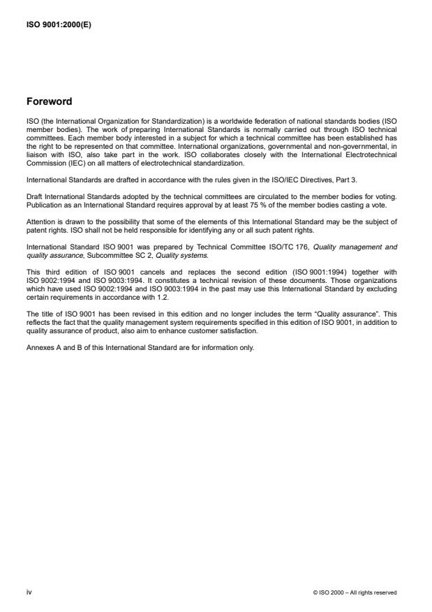 ISO 9001:2000 specifies requirements for a quality management system where an organization needs to demonstrate its ability to consistently provide product that meets customer and applicable regulatory requirements, and aims to enhance customer satisfaction through the effective application of the system, including processes for continual improvement of the system and the assurance of conformity to customer and applicable regulatory requirements. All requirements of this International Standard are generic and are intended to be applicable to all organizations, regardless of type, size and product provided. Where any requirement(s) of this International Standard cannot be applied due to the nature of an organization and its product, this can be considered for exclusion. Where exclusions are made, claims of conformity to this International Standard are not acceptable unless these exclusions are limited to requirements within clause 7, and such exclusions do not affect the organization's ability, or responsibility, to provide product that meets customer and applicable regulatory requirements.