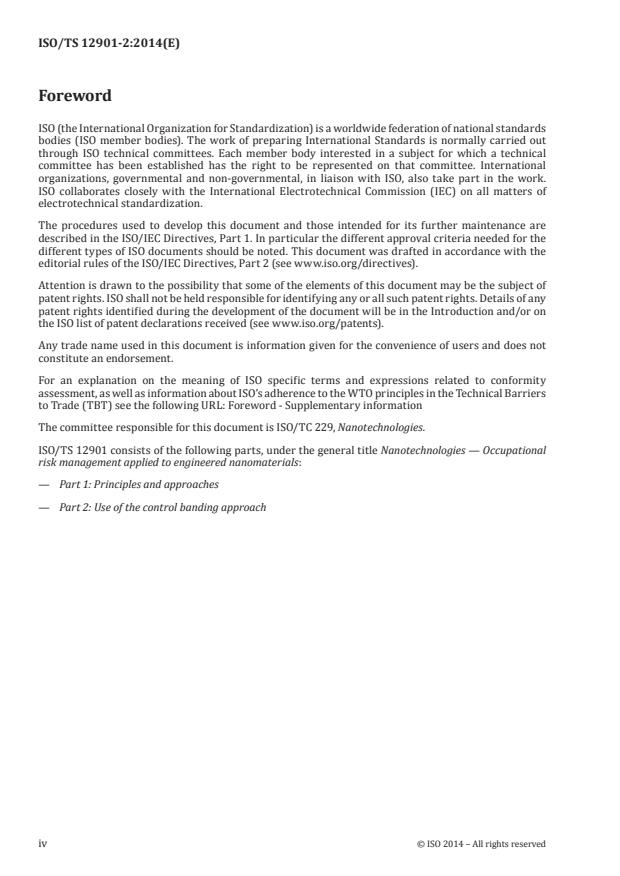 ISO/TS 12901-2:2014 is a technical specification published by the International Organization for Standardization (ISO). Its full title is "Nanotechnologies - Occupational risk management applied to engineered nanomaterials - Part 2: Use of the control banding approach". This standard covers: ISO/TS 12901-2:2014 describes the use of a control banding approach for controlling the risks associated with occupational exposures to nano-objects, and their aggregates and agglomerates greater than 100 nm (NOAA), even if knowledge regarding their toxicity and quantitative exposure estimations is limited or lacking. The ultimate purpose of control banding is to control exposure in order to prevent any possible adverse effects on workers' health. The control banding tool described here is specifically designed for inhalation control. Some guidance for skin and eye protection is given in ISO/TS 12901‑1. ISO/TS 12901-2:2014 is focused on intentionally produced nano-objects such as nanoparticles, nanopowders, nanofibres, nanotubes, nanowires, as well as of aggregates and agglomerates of the same. As used in ISO/TS 12901-2:2014, the term "NOAA" applies to such components, whether in their original form or incorporated in materials or preparations from which they could be released during their lifecycle. ISO/TS 12901-2:2014 is intended to help businesses and others, including research organizations engaged in the manufacturing, processing or handling of NOAA, by providing an easy-to-understand, pragmatic approach for the control of occupational exposures.