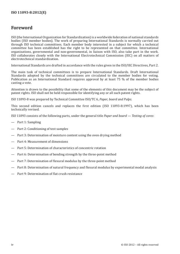 ISO 11093-8:2012 is a standard published by the International Organization for Standardization (ISO). Its full title is "Paper and board — Testing of cores — Part 8: Determination of natural frequency and flexural modulus by experimental modal analysis". This standard covers: ISO 11093-8:2012 specifies a method for the determination of the flexural modulus by using experimentally measured natural frequencies in the free-free mode of transverse vibration of cylindrical paper and board cores.