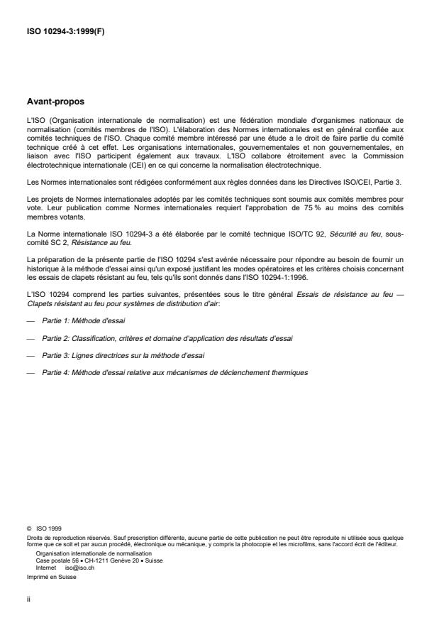ISO 10294-3:1999 is a standard published by the International Organization for Standardization (ISO). Its full title is "Fire resistance tests — Fire dampers for air distribution systems — Part 3: Guidance on the test method". This standard covers: Fire resistance tests — Fire dampers for air distribution systems — Part 3: Guidance on the test method