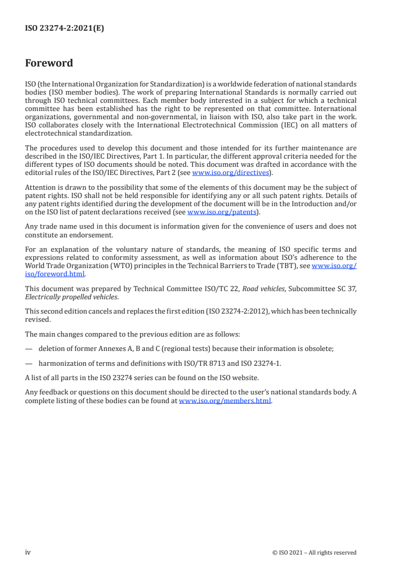 ISO 23274-2:2021 is a standard published by the International Organization for Standardization (ISO). Its full title is "Hybrid-electric road vehicles — Exhaust emissions and fuel consumption measurements — Part 2: Externally chargeable vehicles". This standard covers: This document specifies a chassis dynamometer test procedure to determine the end of the charge-depleting state (CD) and consumed electric energy during CD state. The identification of the end of the CD state is an important step for procedures to determine exhaust emissions and fuel consumption. Final determination of exhaust emissions and fuel consumption is not included in this document. This document applies to vehicles with the following characteristics. — The vehicles are hybrid-electric road vehicles (HEV) with an internal combustion engine (ICE) and an on-board rechargeable energy storage system (RESS) for vehicle propulsion which is supplied with electric energy from an external electric power source. — A CD state, in which the electric energy in the RESS from an external electric power source is consumed, is followed by a charge-sustaining (CS) state in which the fuel energy is consumed sustaining the electric energy of the RESS. — Only batteries are assumed as the RESS of a vehicle. — The RESS is not charged while driving unless by regenerative braking and/or by generative operation driven via the ICE. — External charge for the purpose of conditioning of the RESS is not included. NOTE 1 Trolleybuses and solar powered vehicles are not included in the scope. — The vehicle is classified as a passenger car or light duty truck, as defined in the relevant regional applicable driving test (ADT) standard. — For the ICE, only liquid fuels (for example, gasoline and diesel fuel) are used. NOTE 2 In the case of vehicles with ICE using other fuel [for example, compressed natural gas (CNG), hydrogen (H2)], this document can apply except the measurement of consumed fuel; otherwise the measurement method for those using the corresponding fuel can apply. — The nominal energy of the RESS is at least 2 % of the total energy of consumed fuel over an ADT