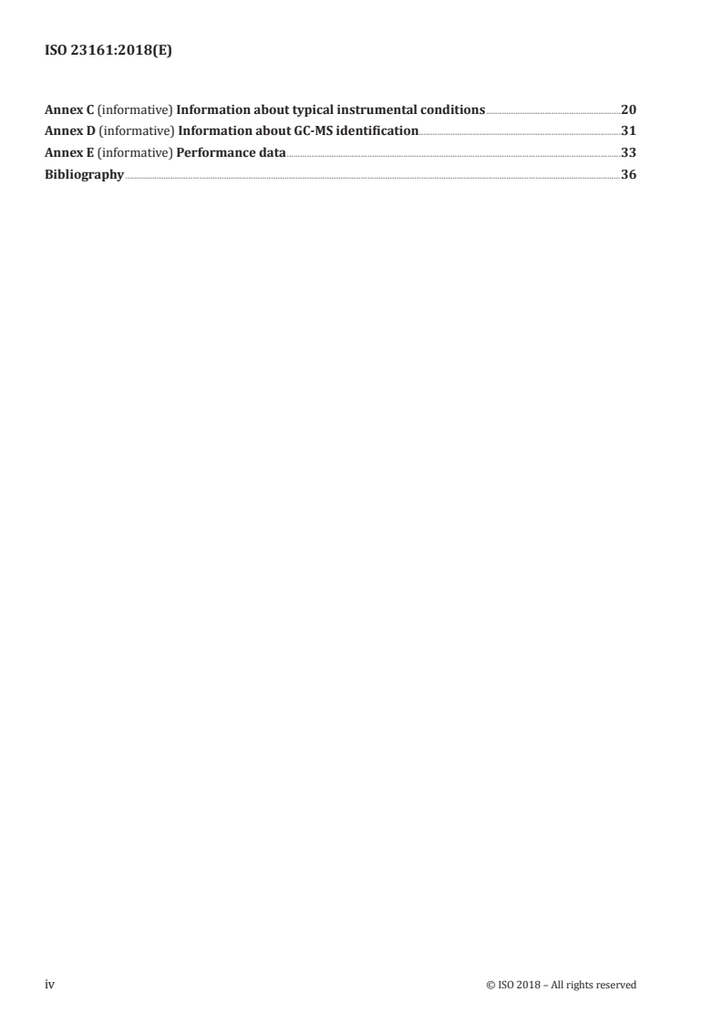- Gas‑chromatographic separation and detection (including GC‑MS identification guidance) are specified; instrumental conditions and validation data are included in informative annexes.