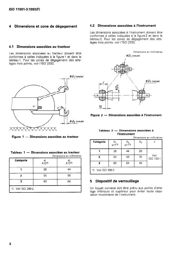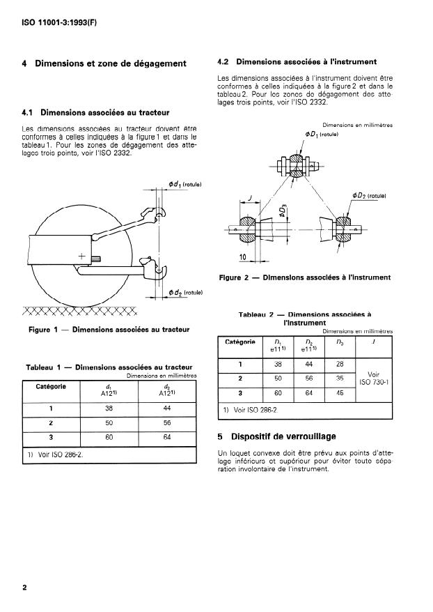 La présente partie de l'ISO 11001 prescrit les dimensions principales permettant de relier l'attelage trois points des instruments aux tracteurs agricoles à roues équipés d'un attelage trois points à barre libre, conformément à l'ISO 730-1 ou à l'ISO 8759-2, et d'un coupleur à rotules. NOTE 1 En général, les dimensions associées au tracteur et à l'instrument pour l'utilisation de coupleurs rapides sont les mêmes que celles spécifiées pour les attelages trois points dans l'ISO 730-1 ou dans l'ISO 8759-2, et que celles spécifiées pour la zone de dégagement dans l'ISO 2332. Les systèmes de couplage rapide trois points constituent une méthode particulière de montage de l'instrument. Les coupleurs rapides sont des éléments additionnels situés entre l'attelage trois points et l'instrument, qui permettent l'attelage et le dételage à partir du siège de l'opérateur. La présente partie de l'ISO 11001 est applicable aux tracteurs agricoles à roues des catégories 1, 2 et 3 définies dans l'ISO 730-l.