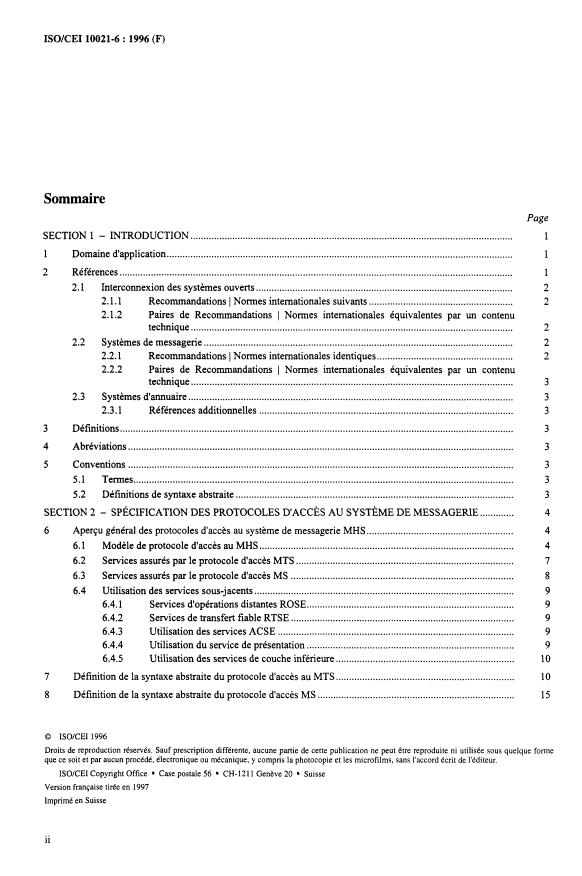 ISO/IEC 10021-6:1996 is a standard published by the International Organization for Standardization (ISO). Its full title is "Information technology — Message Handling Systems (MHS): Protocol specifications — Part 6:". This standard covers: Specifies two MHS Access Protocols (P3, P7) and a MTS Transfer Protocol (P1), their abstract syntax, the mapping onto used services and conformance requirements for systems implementing the protocols.