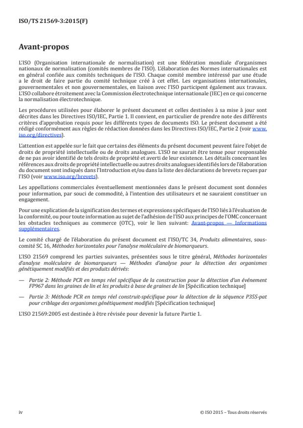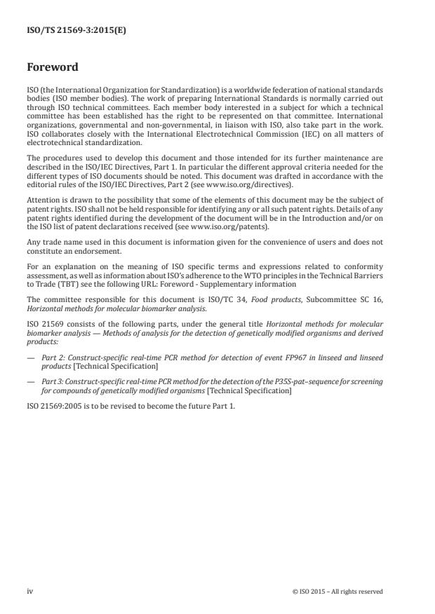 ISO/TS 21569-3:2015 is a technical specification published by the International Organization for Standardization (ISO). Its full title is "Horizontal methods for molecular biomarker analysis — Methods of analysis for the detection of genetically modified organisms and derived products — Part 3: Construct-specific real-time PCR method for detection of P35S-pat-sequence for screening genetically modified organisms". This standard covers: ISO/TS 21569-3:2015 describes a procedure for the detection of the DNA transition sequence between the 35S promotor (P35S) from Cauliflower mosaic virus and a modified phoshinothricin-acetyltransferase gene (pat) from Streptomyces viridochromogenes. ISO/TS 21569-3:2015 is applicable for the analysis of DNA extracted from foodstuffs. It may also be suitable for the analysis of DNA extracted from other products such as feedstuffs and seeds.