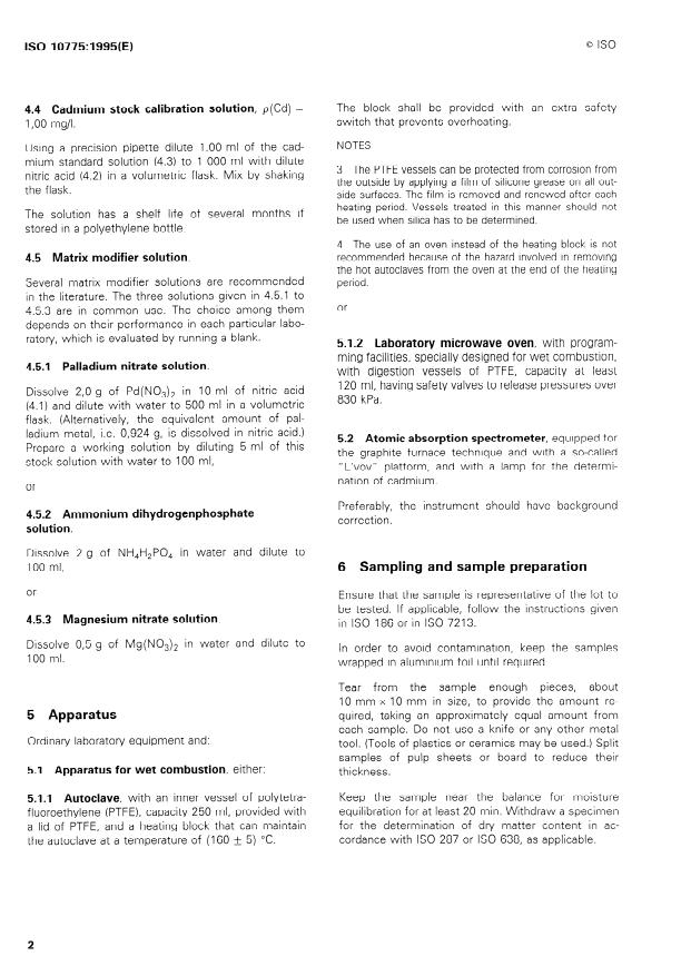 ISO 10775:1995 is a standard published by the International Organization for Standardization (ISO). Its full title is "Paper, board and pulps — Determination of cadmium content — Atomic absorption spectrometric method". This standard covers: Specifies a method for the determination of traces of cadmium in all types of paper, board and pulp, including products containing recycled fibre, that can be wet-combusted in nitric acid.