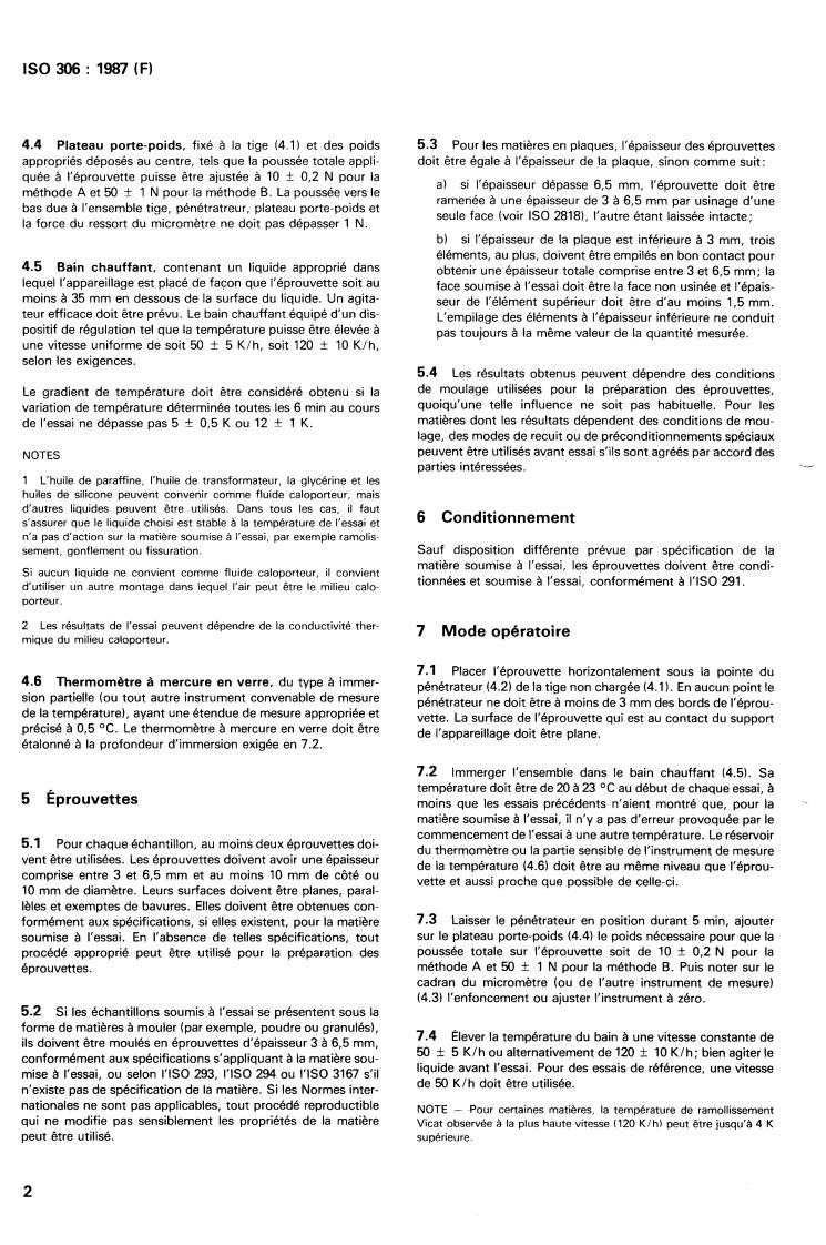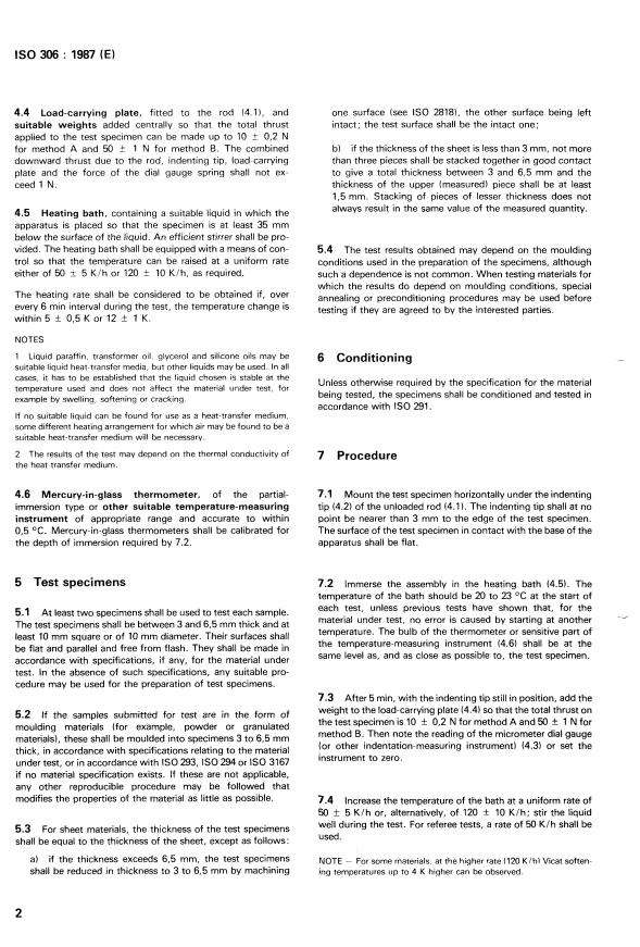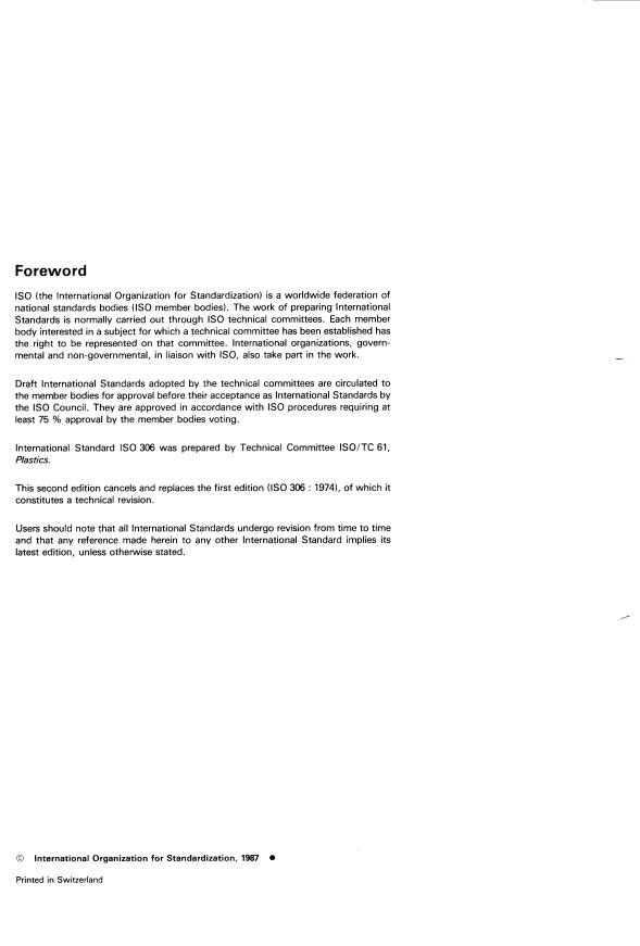 ISO 306:1987 is a standard published by the International Organization for Standardization (ISO). Its full title is "Plastics — Thermoplastic materials — Determination of Vicat softening temperature". This standard covers: Plastics — Thermoplastic materials — Determination of Vicat softening temperature