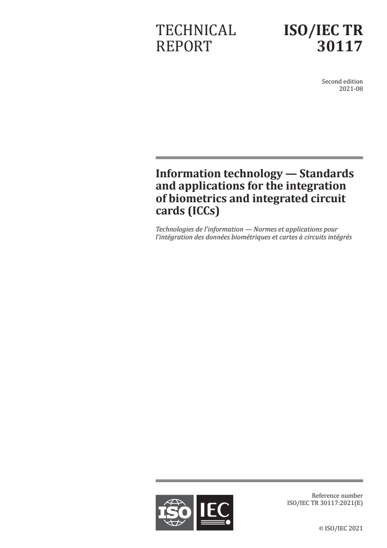 ISO/IEC TR 30117:2021 - Information technology — Standards and applications for the integration of biometrics and integrated circuit cards (ICCs) Released:8/27/2021