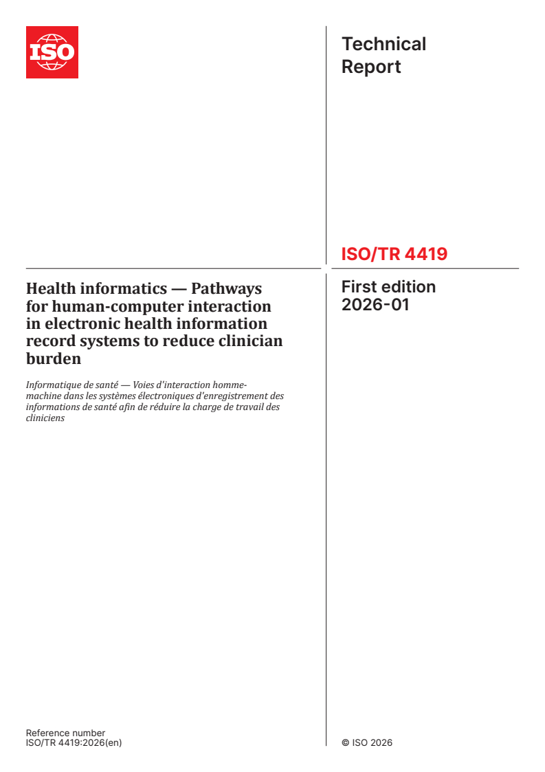 ISO/TR 4419:2026 is a technical report published by the International Organization for Standardization (ISO). Its full title is "Health informatics — Pathways for human-computer interaction in electronic health information record systems to reduce clinician burden". This standard covers: This document reviews the literature regarding human-computer interaction (HCI) theory and user-centred design (UCD) principles in the design and development of electronic health information record systems (HIRS). The focus is on some unintended consequences of HIRS design decisions over the last 15 years and the way that application of HCI and UCD to HIRS data analytics, data representation, and clinical decision support can help to alleviate HIRS-associated clinician burden.