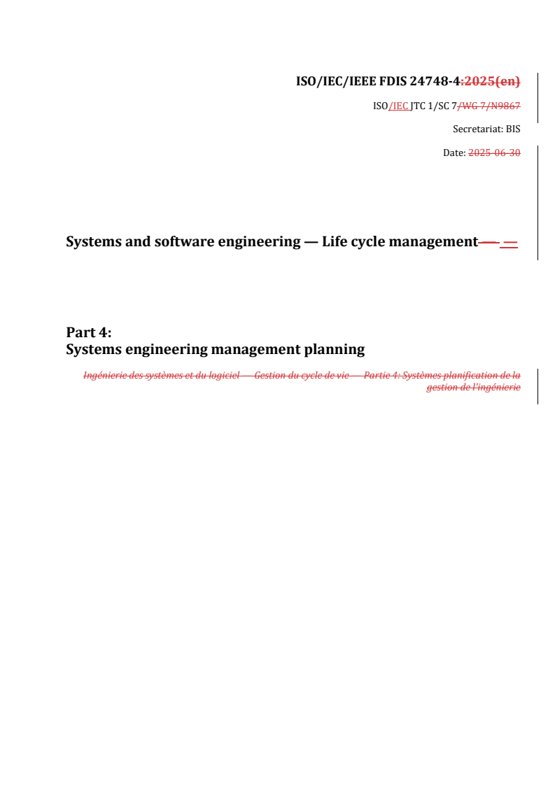 REDLINE ISO/IEC/IEEE FDIS 24748-4 - Systems and software engineering — Life cycle management — Part 4: Systems engineering management planning Released:15. 08. 2025