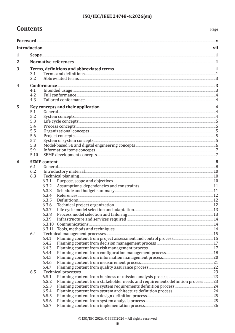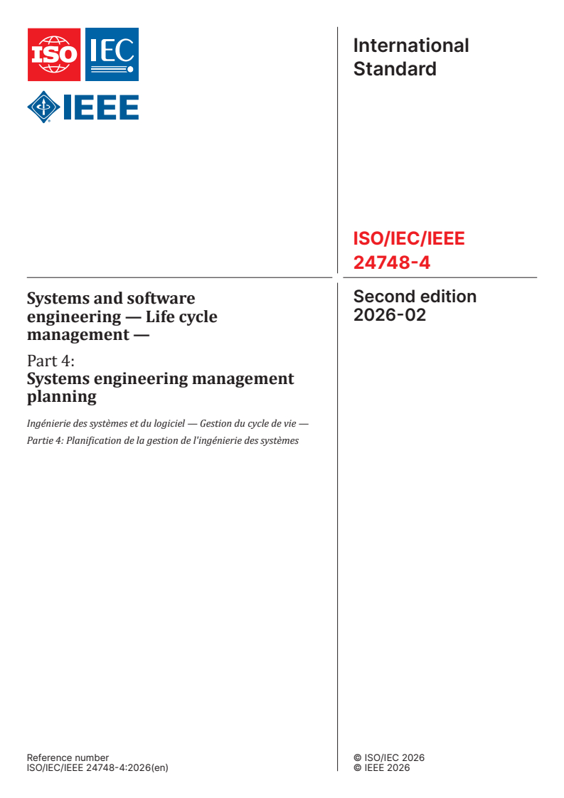 ISO/IEC/IEEE 24748-4:2026 is a standard published by the International Organization for Standardization (ISO). Its full title is "Systems and software engineering — Life cycle management — Part 4: Systems engineering management planning". This standard covers: This document: provides an expanded view of the processes from ISO/IEC/IEEE 15288 that implement systems engineering (SE) management for the life cycles of technical solutions; describes a required information item, termed the systems engineering management plan (SEMP) for the technical management and execution of the SE of technical solutions, provides requirements and guidance for the content of the required information item. This document is applicable to: those who use or plan to use ISO/IEC/IEEE 15288 on projects dealing with human-made systems, products and services; those who are responsible for the technical management of projects concerned with the engineering of systems; those responsible for planning or executing ISO/IEC/IEEE 15288 system life cycle processes at a project level; organizations and individuals involved with a technical project management effort; anyone developing engineering management documentation to complete technical planning aspects of their project’s processes. This document is intended to provide guidance for two-party situations and can be equally applied where the two parties are from the same organization. This document can also be used by a single party as self-imposed tasks. This document can also serve as guidance in multi-party situations, where high risks are inherent in the supply and integration of complex systems, and procurement can involve several suppliers, organizations or parties.