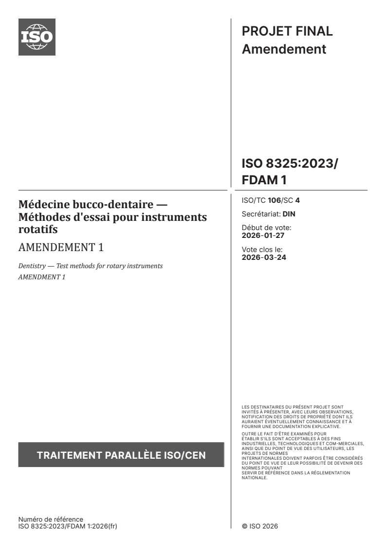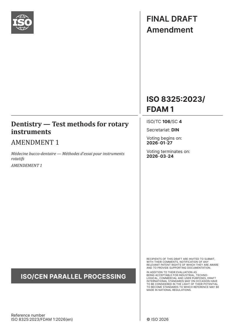 ISO 8325:2023/FDAmd 1 - Médecine bucco-dentaire — Méthodes d'essai pour instruments rotatifs — Amendement 1 Released:23. 01. 2026