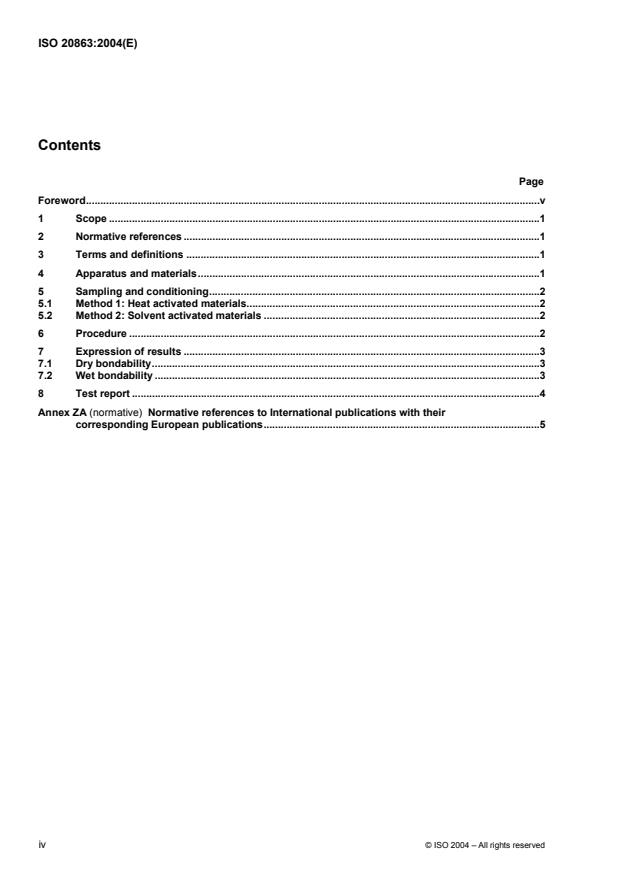 ISO 20863:2004 is a standard published by the International Organization for Standardization (ISO). Its full title is "Footwear — Test methods for stiffeners and toepuffs — Bondability". This standard covers: ISO 20863:2004 specifies a method for the determination of the bondability of heat activated and solvent activated stiffeners and toepuffs to upper and lining materials.