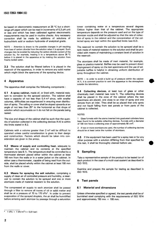 ISO 7253:1984 is a standard published by the International Organization for Standardization (ISO). Its full title is "Paints and varnishes — Determination of resistance to neutral salt spray". This standard covers: Paints and varnishes — Determination of resistance to neutral salt spray