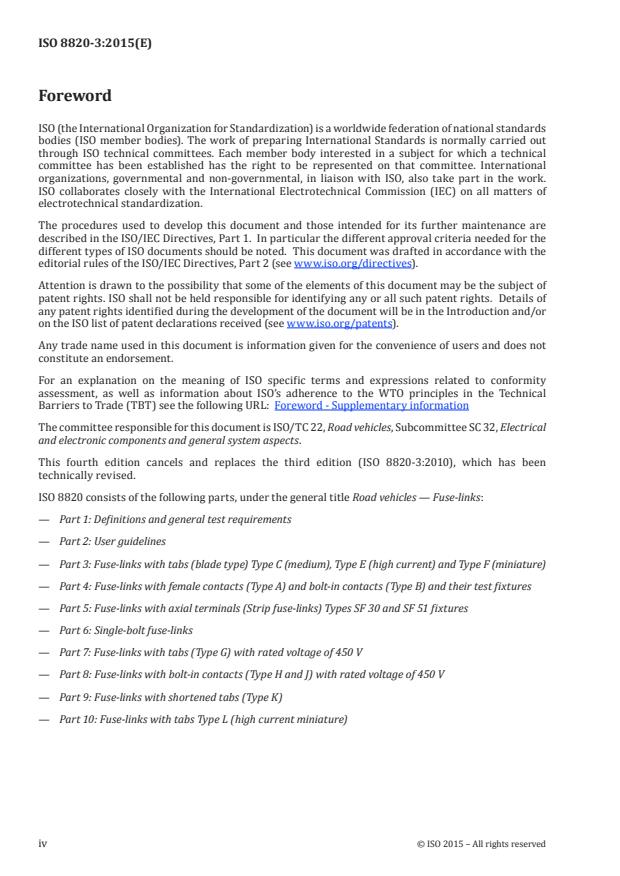 ISO 8820-3:2015 is a standard published by the International Organization for Standardization (ISO). Its full title is "Road vehicles - Fuse-links - Part 3: Fuse-links with tabs (blade type) Type C (medium), Type E (high current) and Type F (miniature)". This standard covers: ISO 8820-3:2015 specifies fuse-links with tabs (blade-type) Type C (medium), Type E (high current), and Type F (miniature) for use in road vehicles. It establishes, for these fuse-link types, the rated current, test procedures, performance requirements, and dimensions. ISO 8820-3:2015 is applicable for fuse-links with a rated voltage of 32 V or 58 V, a current rating of ≤100 A, and a breaking capacity of 1 000 A intended for use in road vehicles. ISO 8820-3:2015 is intended to be used in conjunction with ISO 8820‑1 and ISO 8820‑2. The numbering of its clauses corresponds to that of ISO 8820‑1, whose requirements are applicable, except where modified by requirements particular to this part of ISO 8820.
